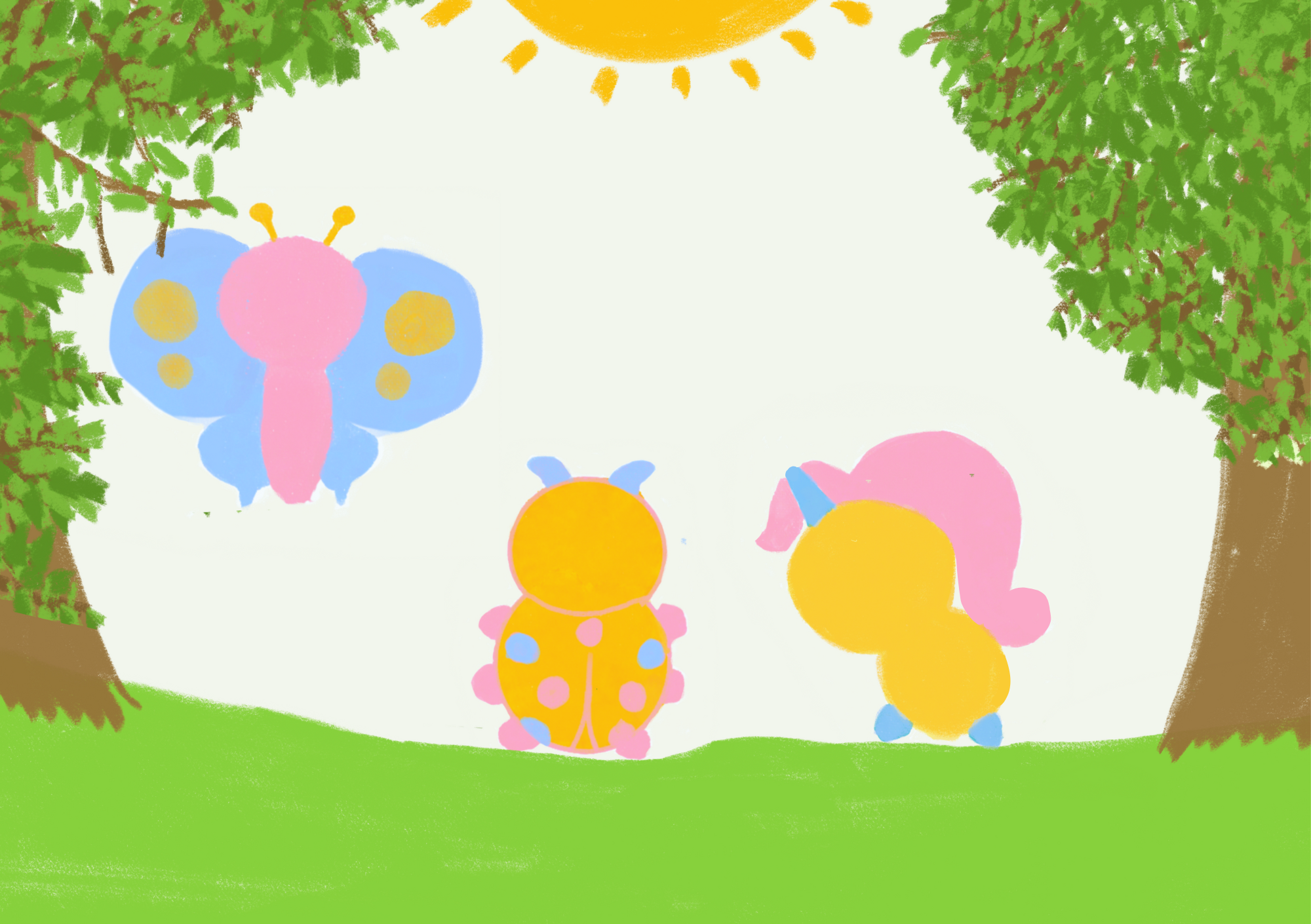 V této zahradě žili vedle sebe tři sousedé: Jednorožec, Beruška a Motýlek. Každý z nich měl svou vlastní část, takovou svou malinkou zahrádku, která byla plná nádherných květin – ale vždy jen jedné barvy. Beruška měla zářivě oranžové květiny, Jednorožec pěstoval modré a Motýlek růžové.